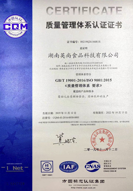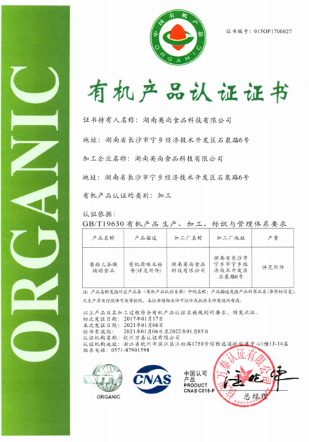 英尚以產(chǎn)品質(zhì)量安全第一為己任,建立10萬級(jí)GMP車間的自有輔食現(xiàn)代化工廠,并且已經(jīng)通過了ISO9001質(zhì)量體系認(rèn)證、HACCP認(rèn)證,有機(jī)生產(chǎn)認(rèn)證。