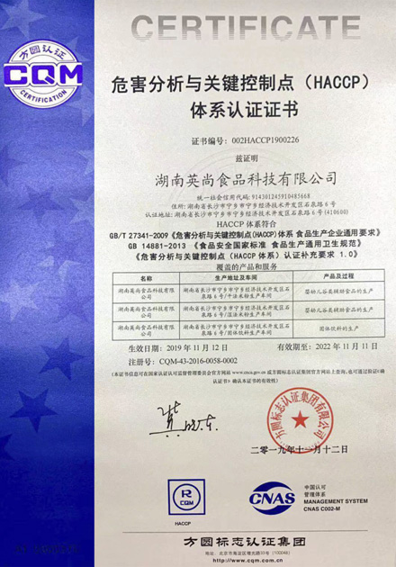 通過國家ISO9001質(zhì)量管理體系認(rèn)證、食品HACCP體系認(rèn)證。