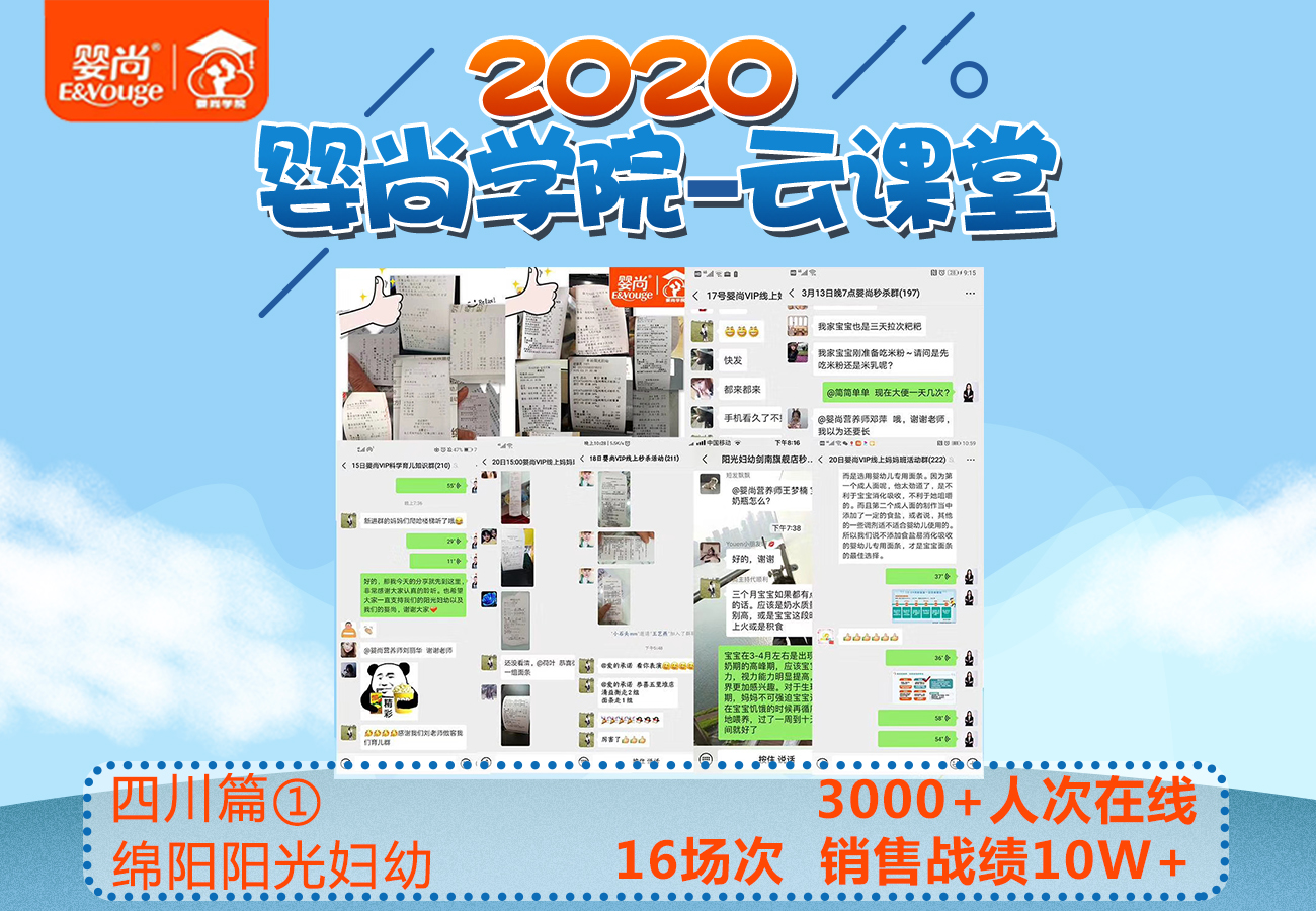2月份嬰尚在全國進(jìn)行了100多場次云課堂,3月份進(jìn)行了200多場云課堂,其中在四川省區(qū)代順利經(jīng)理負(fù)責(zé)的綿陽區(qū)域3月份總做了16場線上云課堂,有3000+人次在線,最高場次突破10000元,總銷量達(dá)10萬+,這無疑是對云課堂最大的肯定。