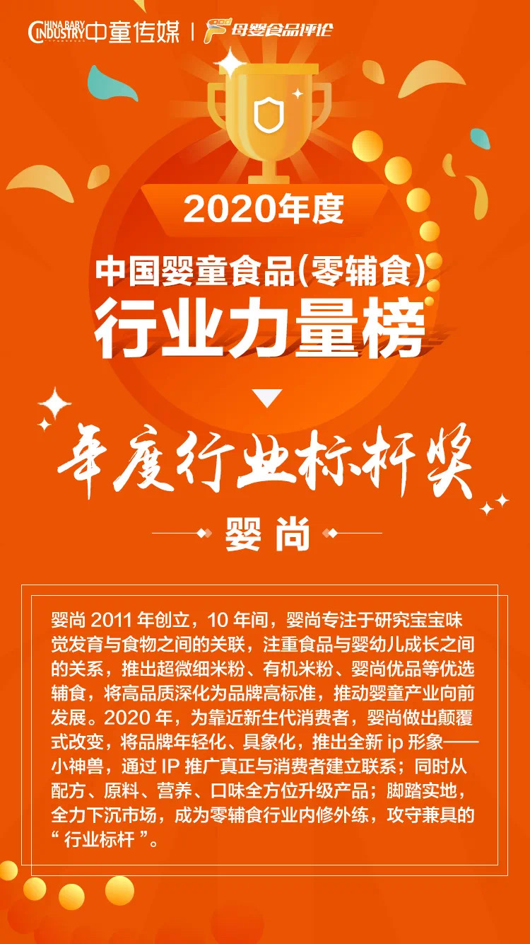 嬰尚品牌榮膺年度行業(yè)標桿大獎。嬰尚2011年創(chuàng)立,10年間,嬰尚專注于研究寶寶味覺發(fā)育與食物之間的關(guān)聯(lián),注重食品與嬰幼兒成長之間的關(guān)系,推出超微細米粉、有機米粉、嬰尚優(yōu)品等優(yōu)選輔食,將高品質(zhì)深化為品牌高標準,推動嬰童產(chǎn)業(yè)向前發(fā)展。2020年,為靠近新生代消費者,嬰尚做出顛覆式改變,將品牌年輕化、具象化,推出全新ip形象一小神獸,通過IP推廣真正與消費者建立聯(lián)系;同時從配方、原料、營養(yǎng)、口味全方位升級產(chǎn)品;腳踏實地,全力下沉市場,成為零輔食行業(yè)內(nèi)修外練,攻守兼具的“行業(yè)標桿”。
