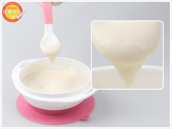沖調(diào)好后的米粉,瑩潤(rùn)細(xì)膩,溶解均勻,沒有發(fā)現(xiàn)未溶團(tuán)塊與顆粒物,溶解性非常優(yōu)秀,不會(huì)給寶寶造成消化負(fù)擔(dān)。