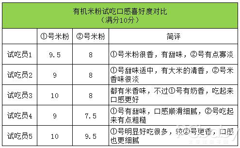 編輯沖調(diào)好嬰尚有機(jī)米粉與品牌A有機(jī)米粉,分別命名為①號(hào)和②號(hào),邀請(qǐng)5位試吃員進(jìn)行試吃。從試吃員反饋的情況來看,①號(hào)米粉較香甜,且有奶香味,更細(xì)膩,吃起來味道更好,②號(hào)有機(jī)米粉則口味比較寡淡,口感也不如①號(hào)細(xì)膩。最后,①號(hào)(嬰尚有機(jī)米粉)以47.5分的總分擊?、谔?hào)(品牌A有機(jī)米粉)的41分,口感完勝。