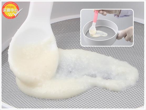 1、用輔食勺舀起沖調(diào)好的米粉,緩緩向下傾倒,觀察其粘稠度。