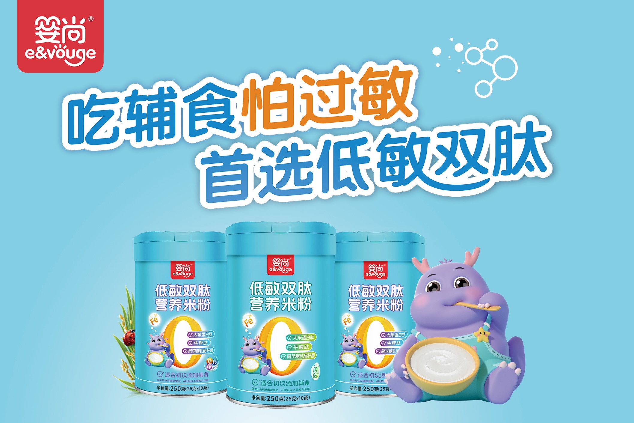 作為敏寶的媽媽第一次添加輔食的時候總是會充滿焦慮,擔心輔食成為食物過敏源,但是家長們都知道7-12月齡嬰兒97%的鐵需要來自輔食,鐵缺乏和缺鐵性貧血可損害嬰幼兒認知發(fā)育和免疫功能。添加富含鐵的輔食是保證嬰幼兒鐵需要的主要措施,因此嬰尚從關愛敏寶健康出發(fā),推出了低敏雙肽米粉,專為敏寶研制。